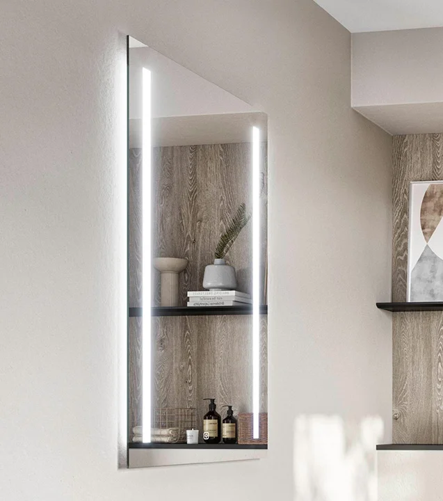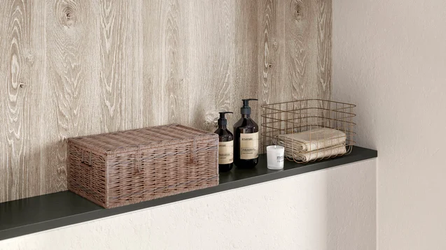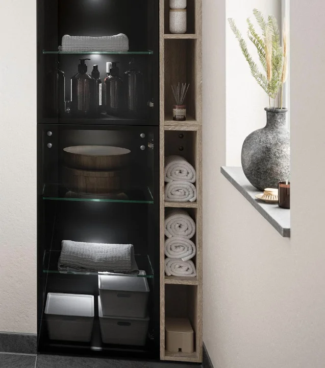 Tako čudovite lahko so rešitve za shranjevanje prostora v kopalnici. Odprti nosilni sistem polic, pritrjen na stebre, je mogoče oblikovati v različnih dimenzijah in zagotavlja domače vzdušje, ki ga dodatno poudarjajo površine v toplem terakotnem sivem videzu betona.